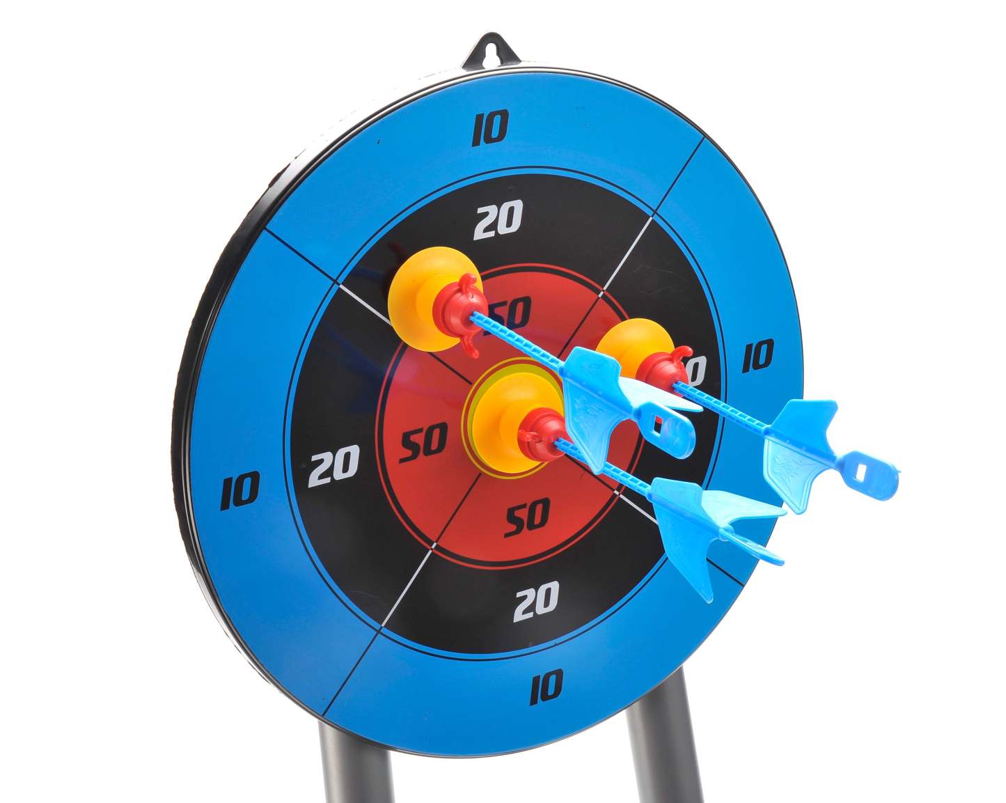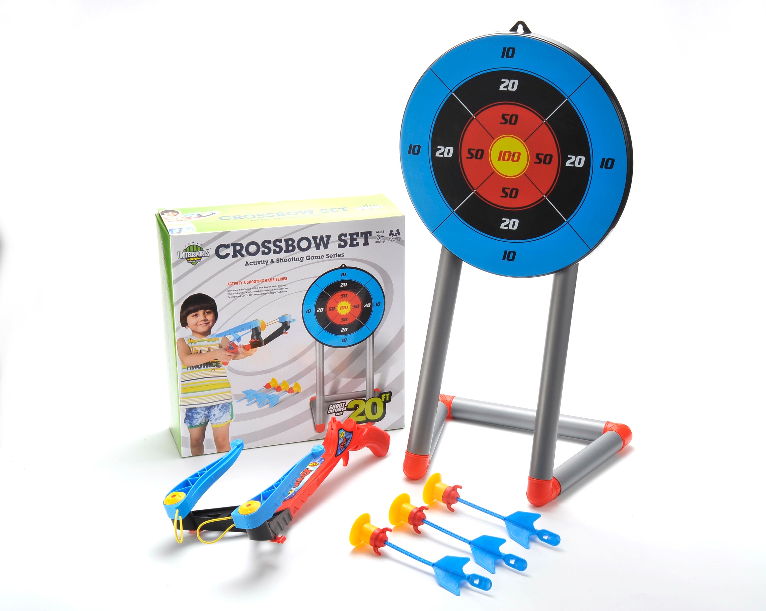 Packaging includes an archery stand, 3 arrows, infrared light for better aiming and a plastic quiver for holding the arrows.