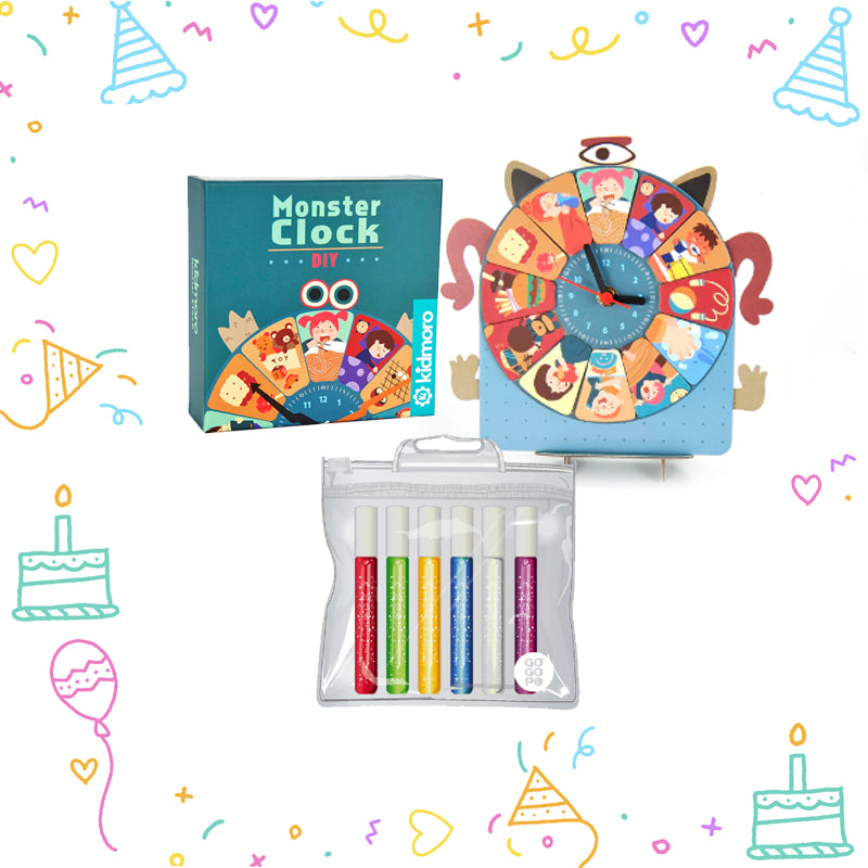 Edu Dux Goodie Bag for Boys & Girls Aged 6 to 12 Years, Monster Clock and Glitter Glue