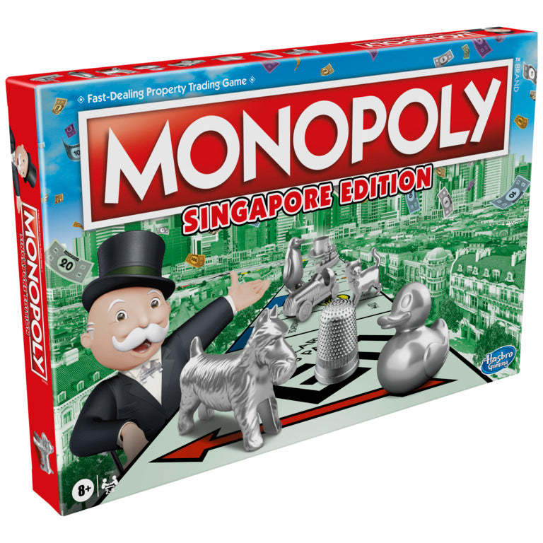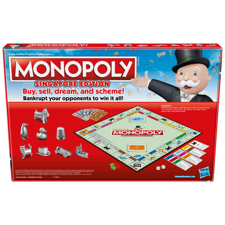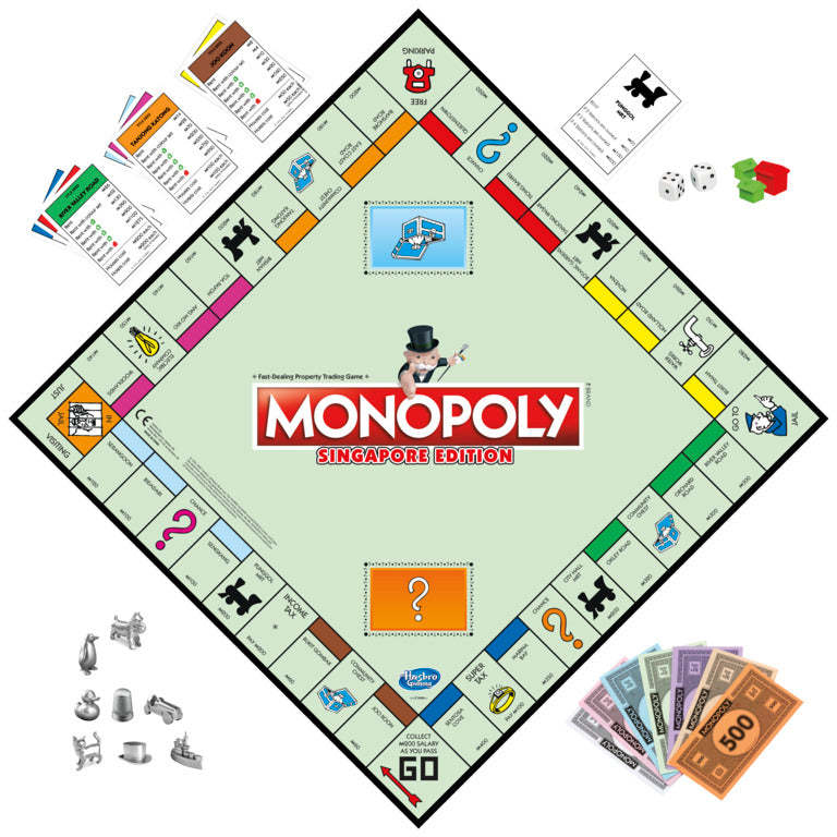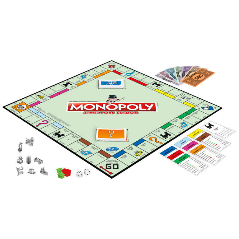 Includes gameboard, 8 Tokens, 28 Title Deed Cards, 16 Chance Cards, 16 Community Chest Cards, 32 Houses, 12 Hotels, 2 Dice, Money Pack, and instructions.