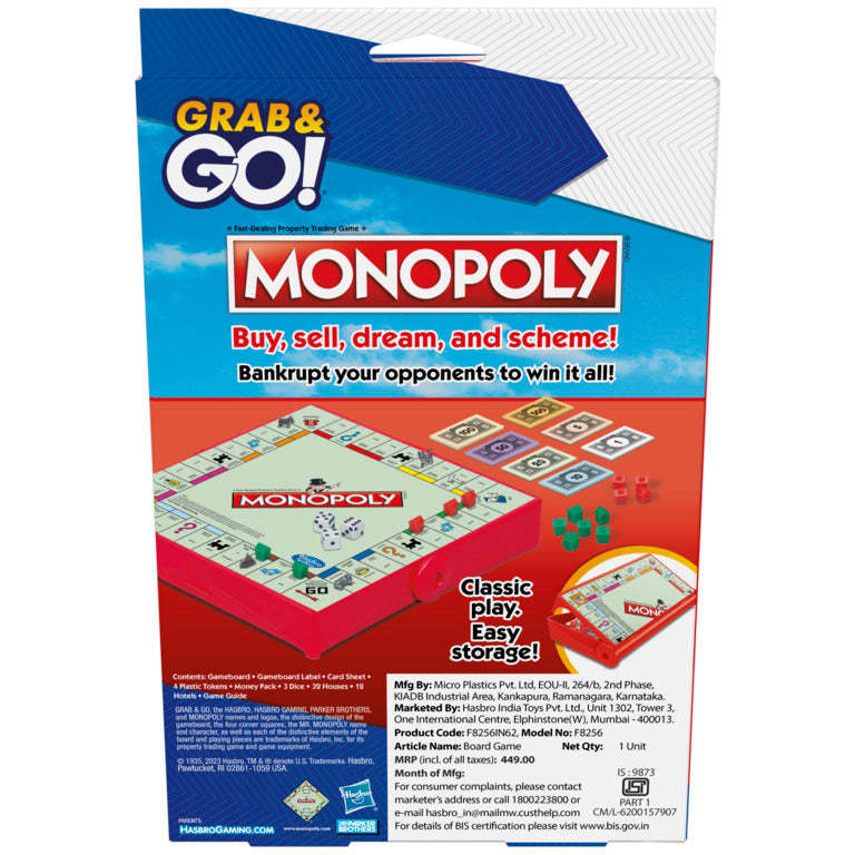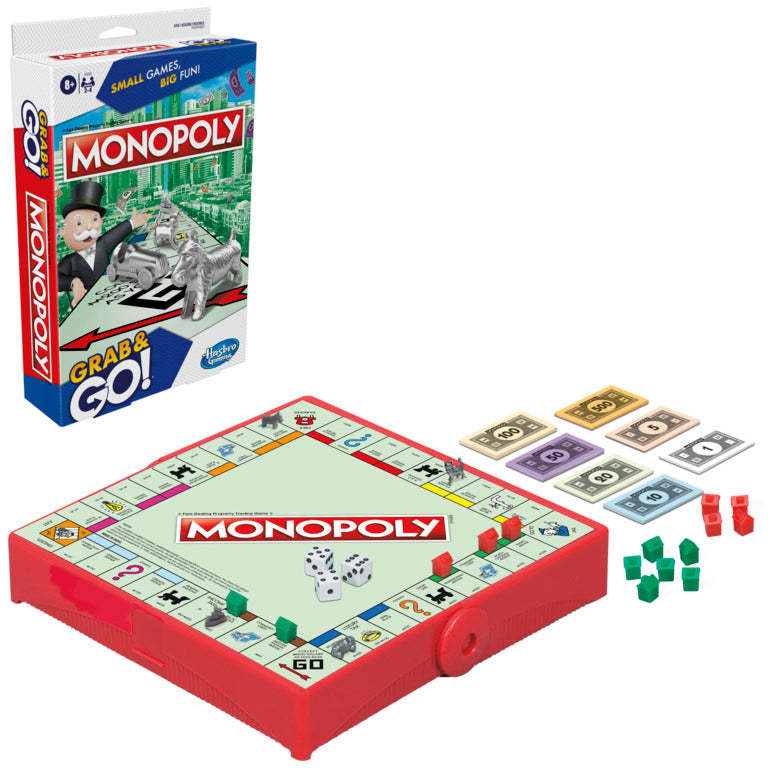 PORTABLE VERSION OF MONOPOLY GAME: Same classic gameplay in a compact format! The Monopoly Grab and Go game for ages 8 and up is a mini, portable version of the Monopoly board game for fun on the run