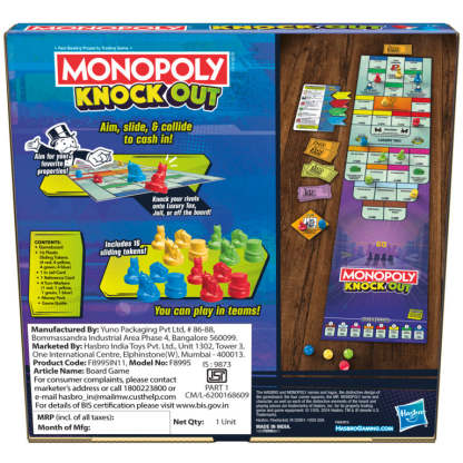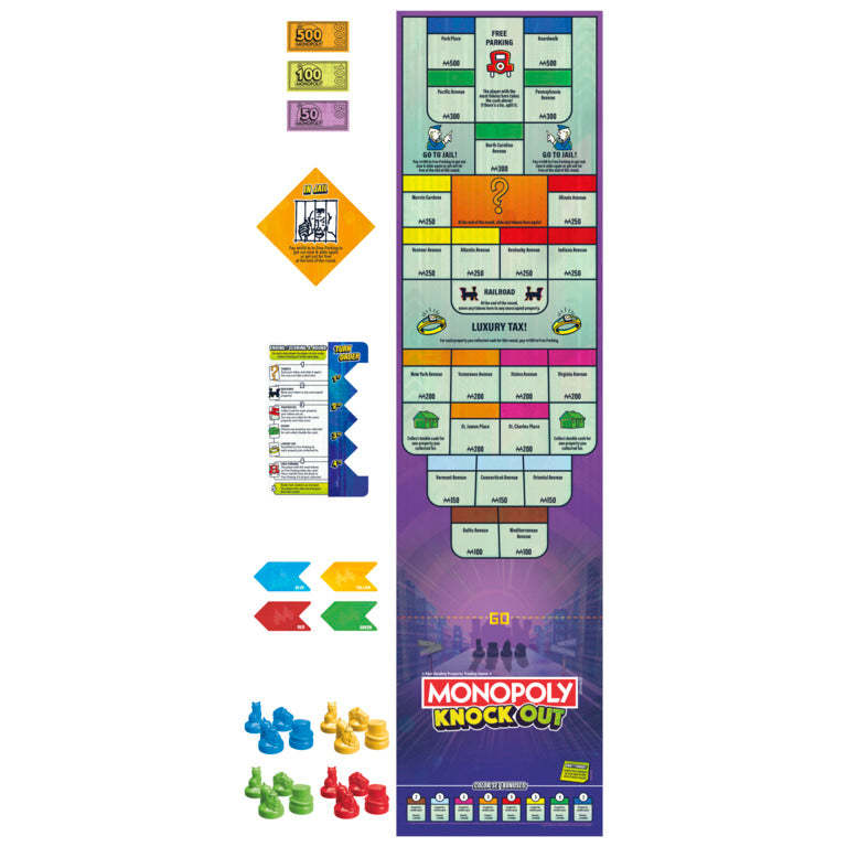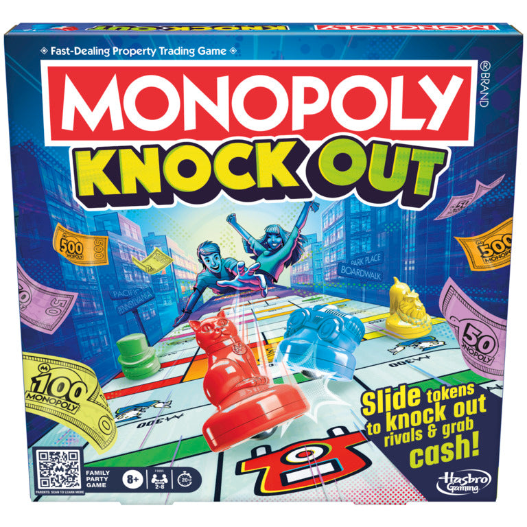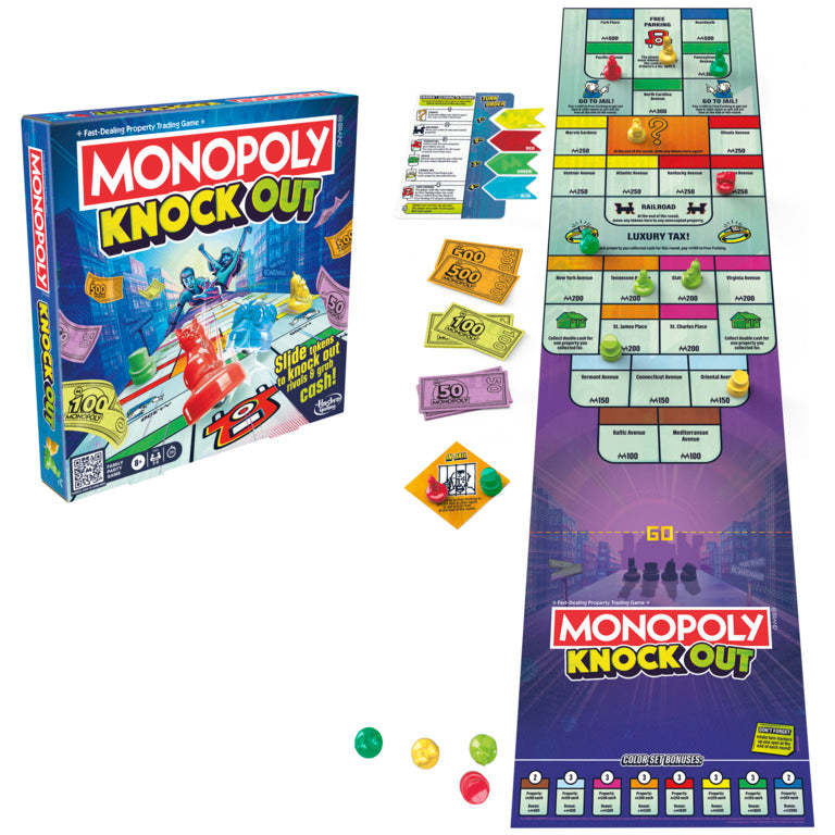 The Monopoly Knockout game is the family party game of sliding tokens and cash-grabbing fun! In this up-and-active version of the Monopoly game, compete against opponents in a token showdown! Players play in rounds, taking turns sliding their tokens down the long gameboard (over 3 feet!) and trying to land them on properties. At the end of each round, they’ll collect—or pay—cash based on where their tokens ended up. So aim and slide carefully, landing tokens on the best properties and knocking other players' tokens into Jail or totally off the board. The player with the most cash at the end of the game wins! Looking for family party games for kids and adults or fun games for game night? This light strategy game is a great game for family gatherings, vacations, and more.
