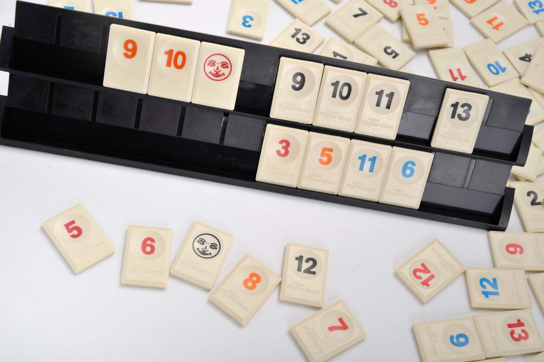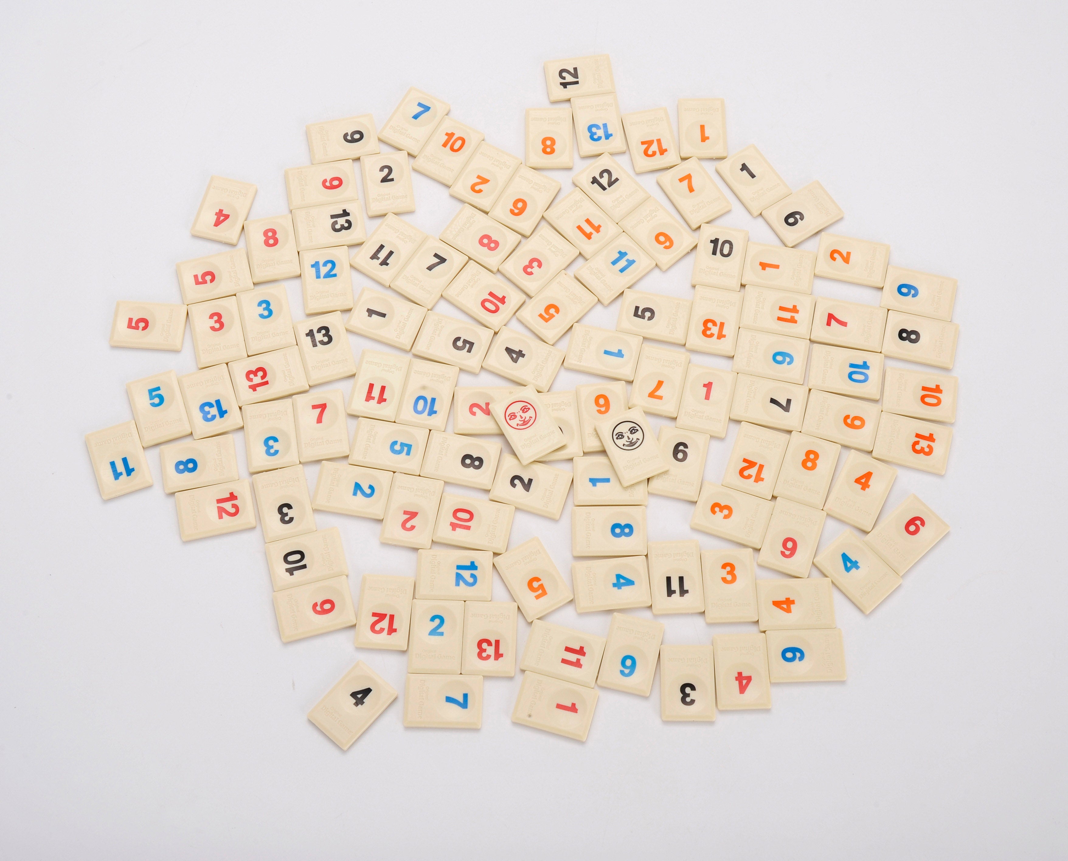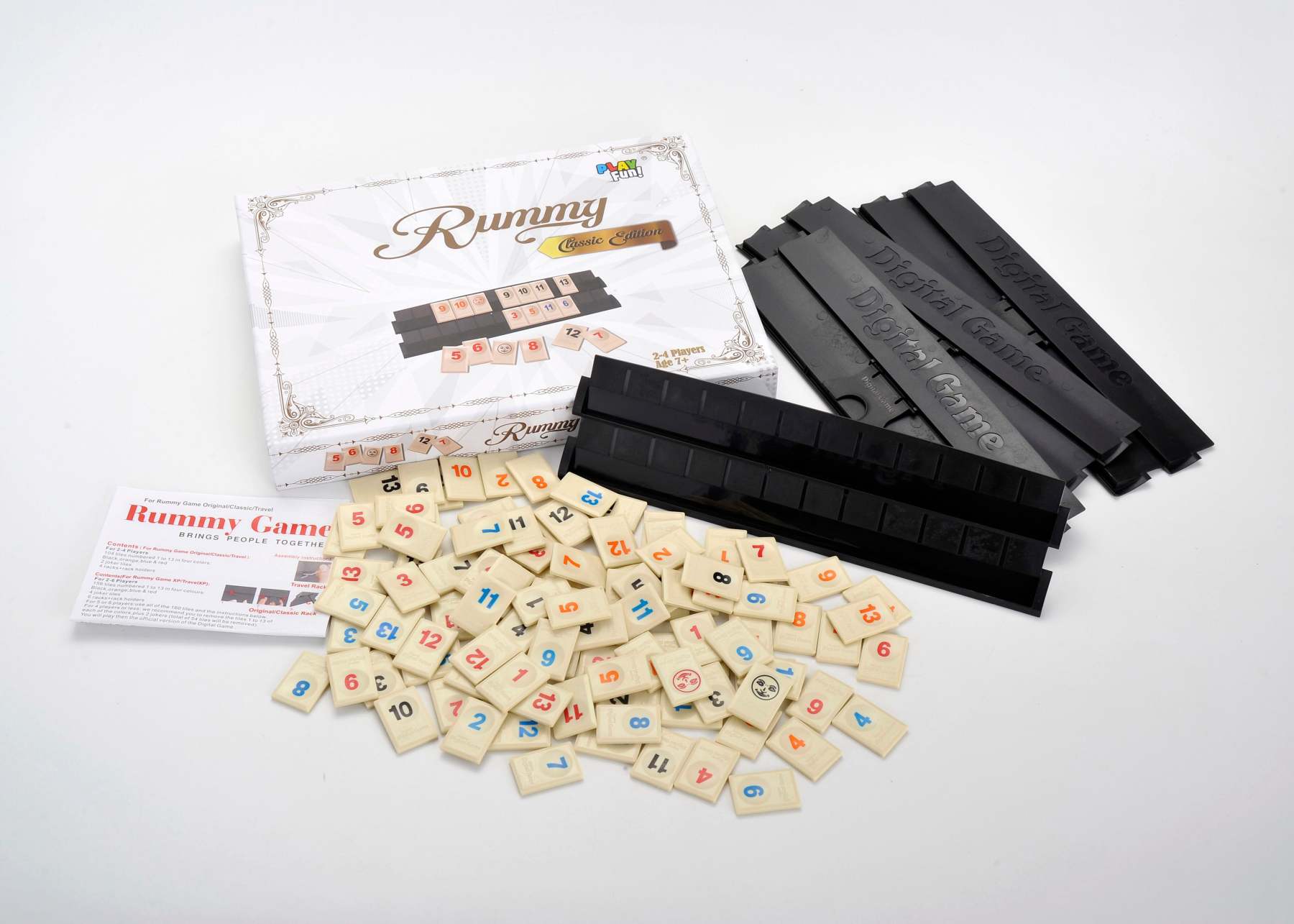 Contents: 106 Tiles (8 sets of Tiles 1-13 in 4 Colours and 2 Jokers), 4 Racks (and holders), detailed rules.
