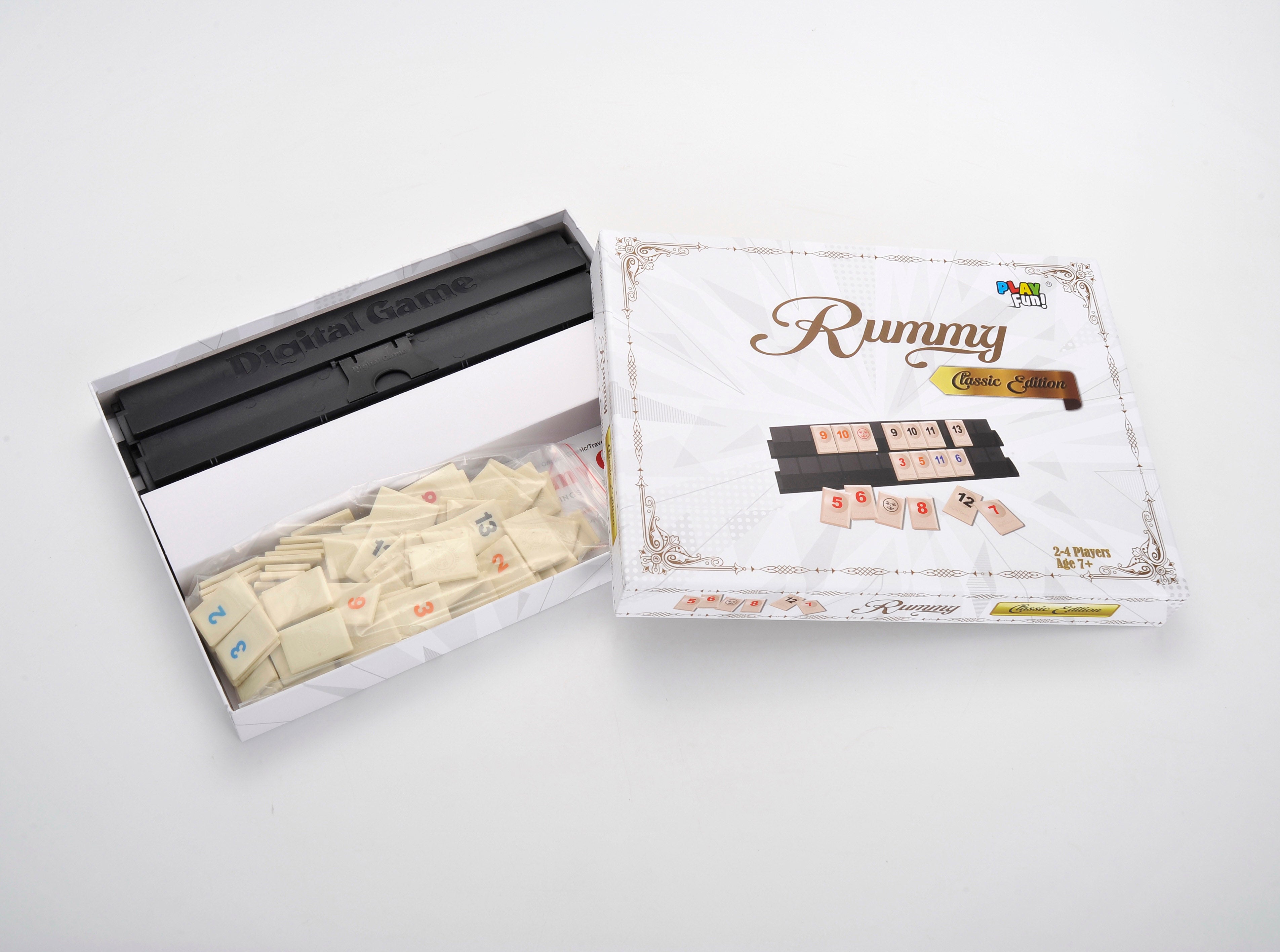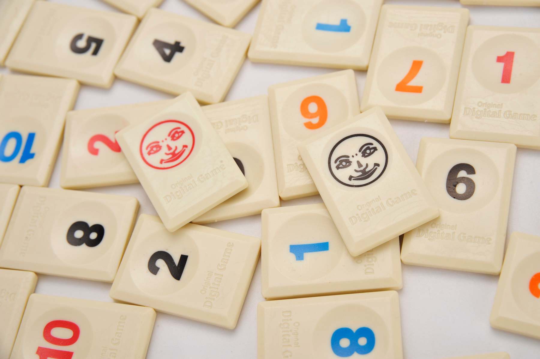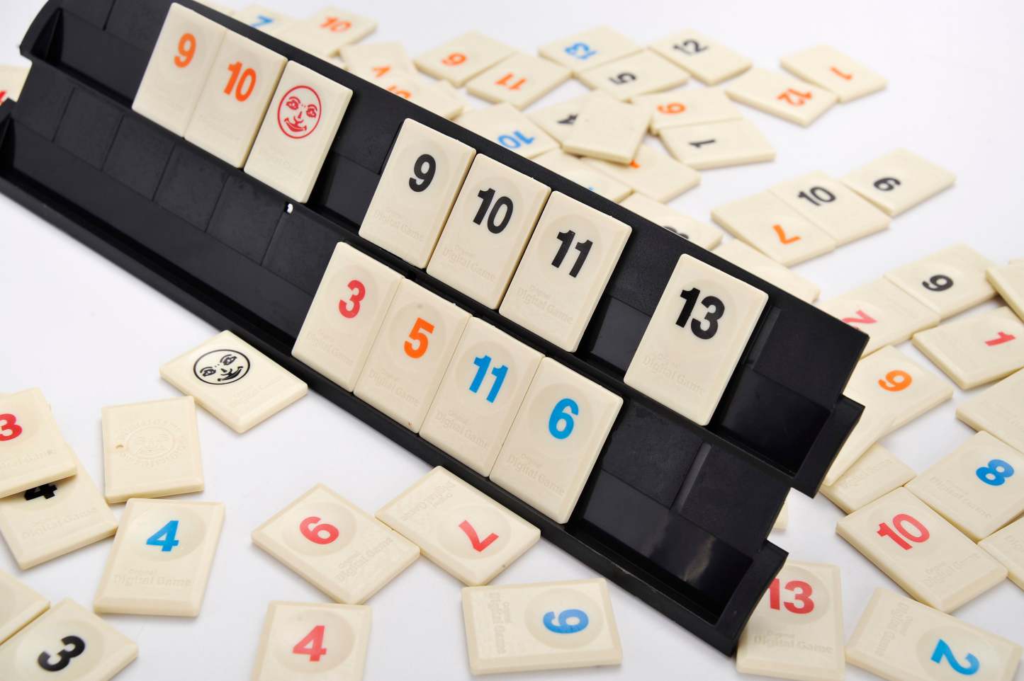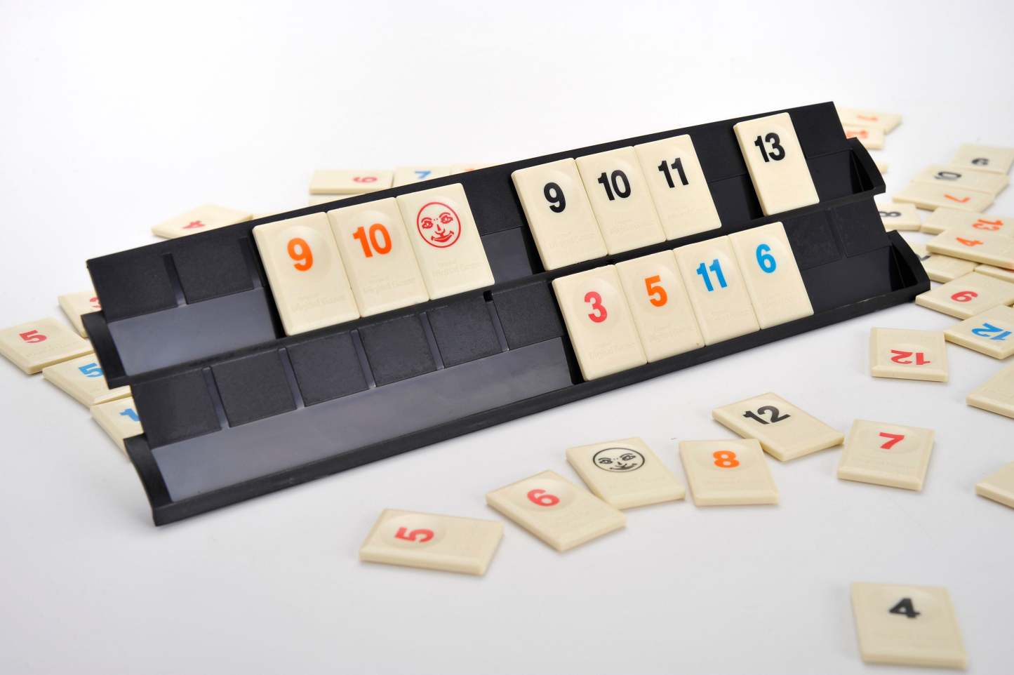 Contents: 106 Tiles (8 sets of Tiles 1-13 in 4 Colours and 2 Jokers), 4 Racks (and holders), detailed rules.