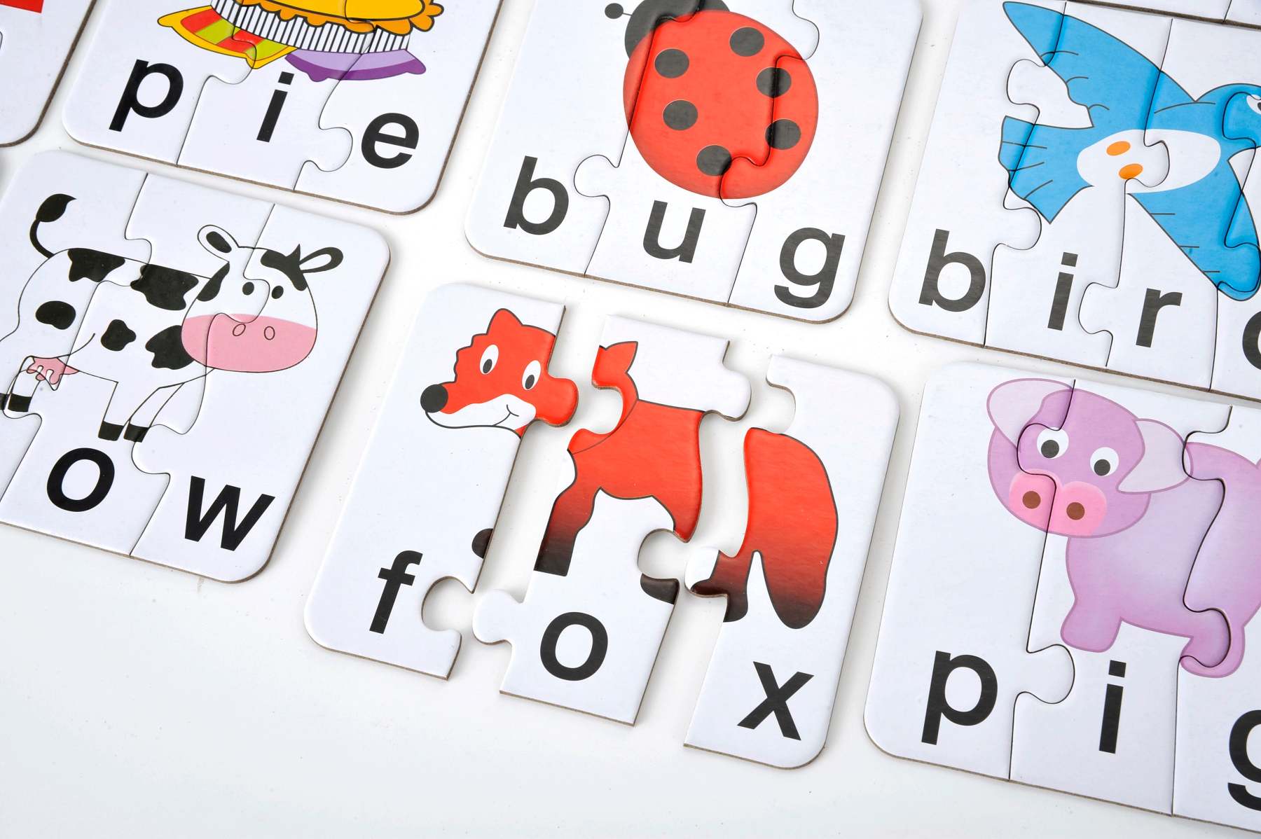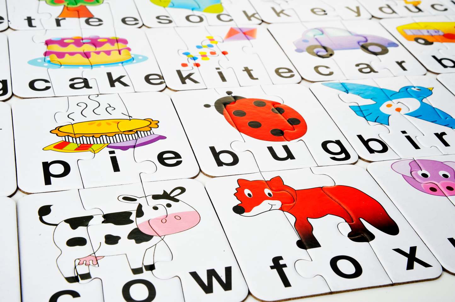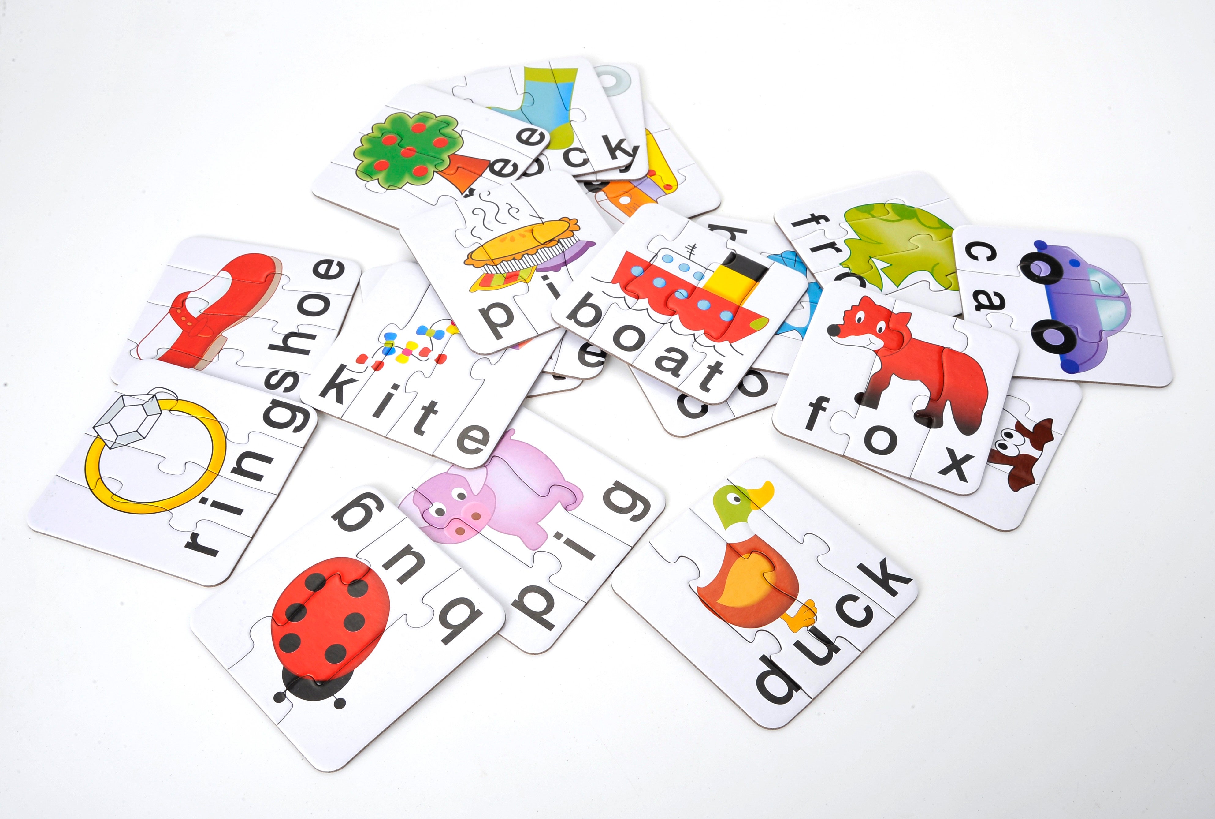 By looking at the piece of the picture and the letter on the card, you can spell out the jigsaw! All the words are 3-4 letters so, for instance, a cow would be made up of 3 pieces and a cake out of 4. Match It!