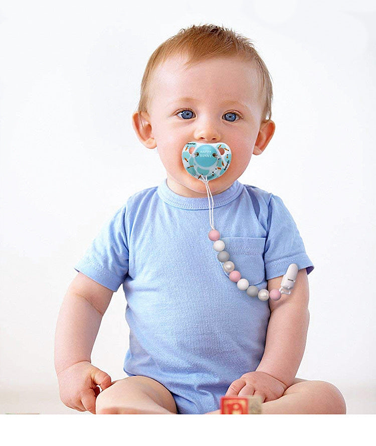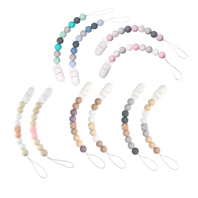 We use plastic clip without metal to prevent rust that may dirty the baby's clothes or hurt their teeth or gums.